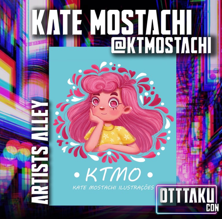 Kate Mostachi é uma designer e ilustradora de Londrina, e suas criações misturam cores vibrantes, cultura pop e muita autenticidade! Ela trará suas fofissimas artes autorais e fanarts em forma de prints, adesivos, bottons e outros produtos pra vocês!